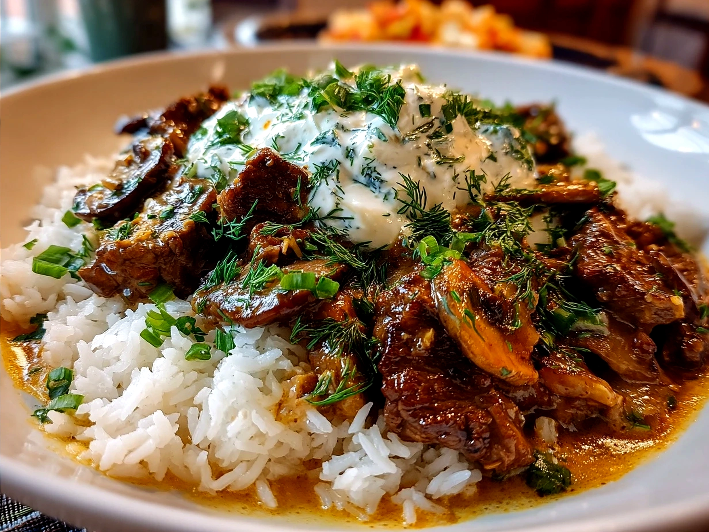 A classic Russian-inspired dish featuring tender strips of beef and mushrooms in a creamy sour cream sauce, perfect served over egg noodles or rice.