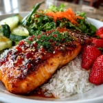 This Honey Glazed Salmon Bowl features tender salmon fillets brushed with a sweet honey glaze, served over a bed of steamed rice and fresh vegetables for a wholesome, flavorful meal.