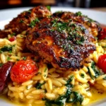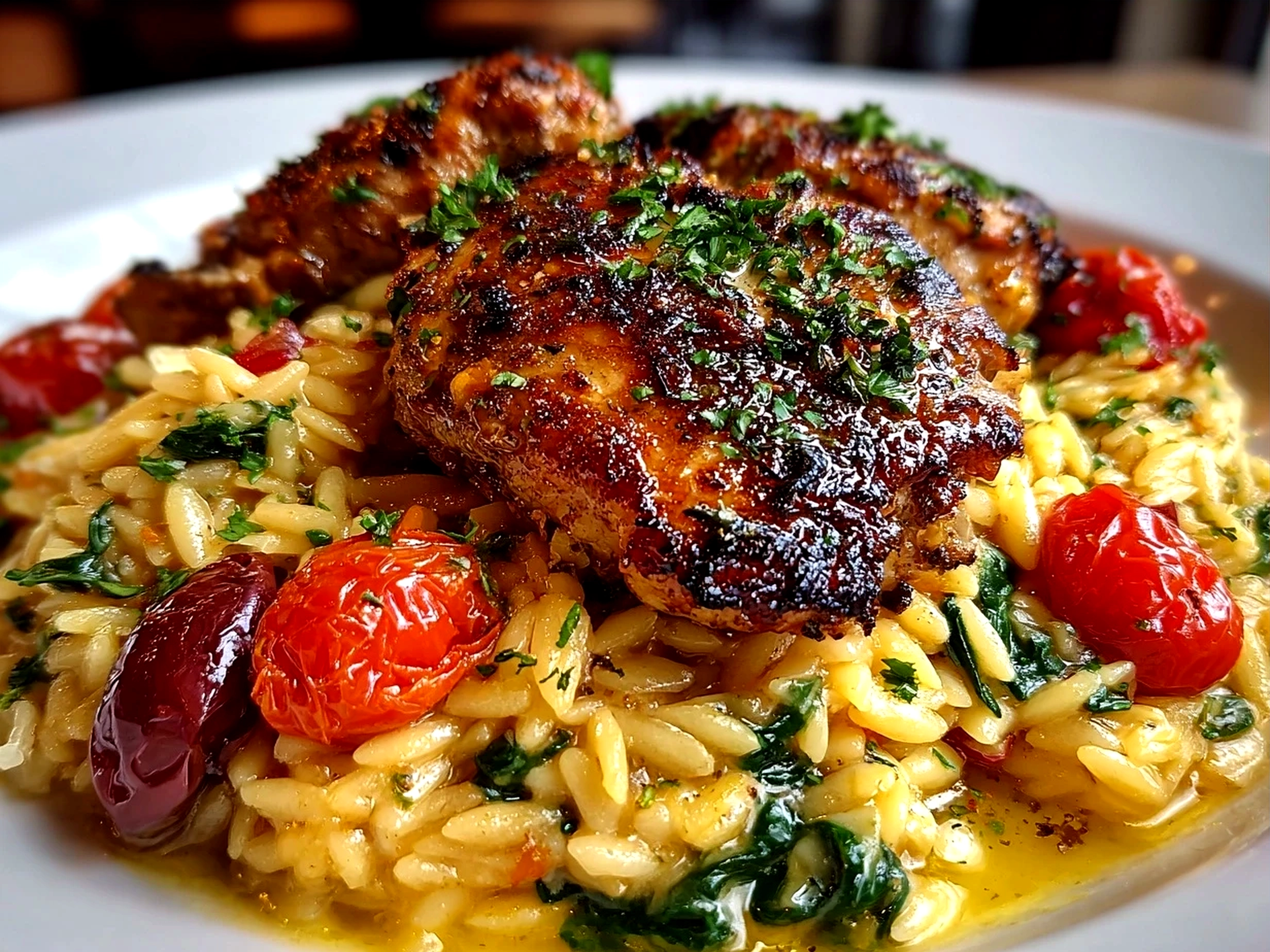 A vibrant and flavorful Mediterranean Chicken Orzo combining tender chicken, sun-dried tomatoes, olives, and fresh herbs for a wholesome, easy weeknight meal.