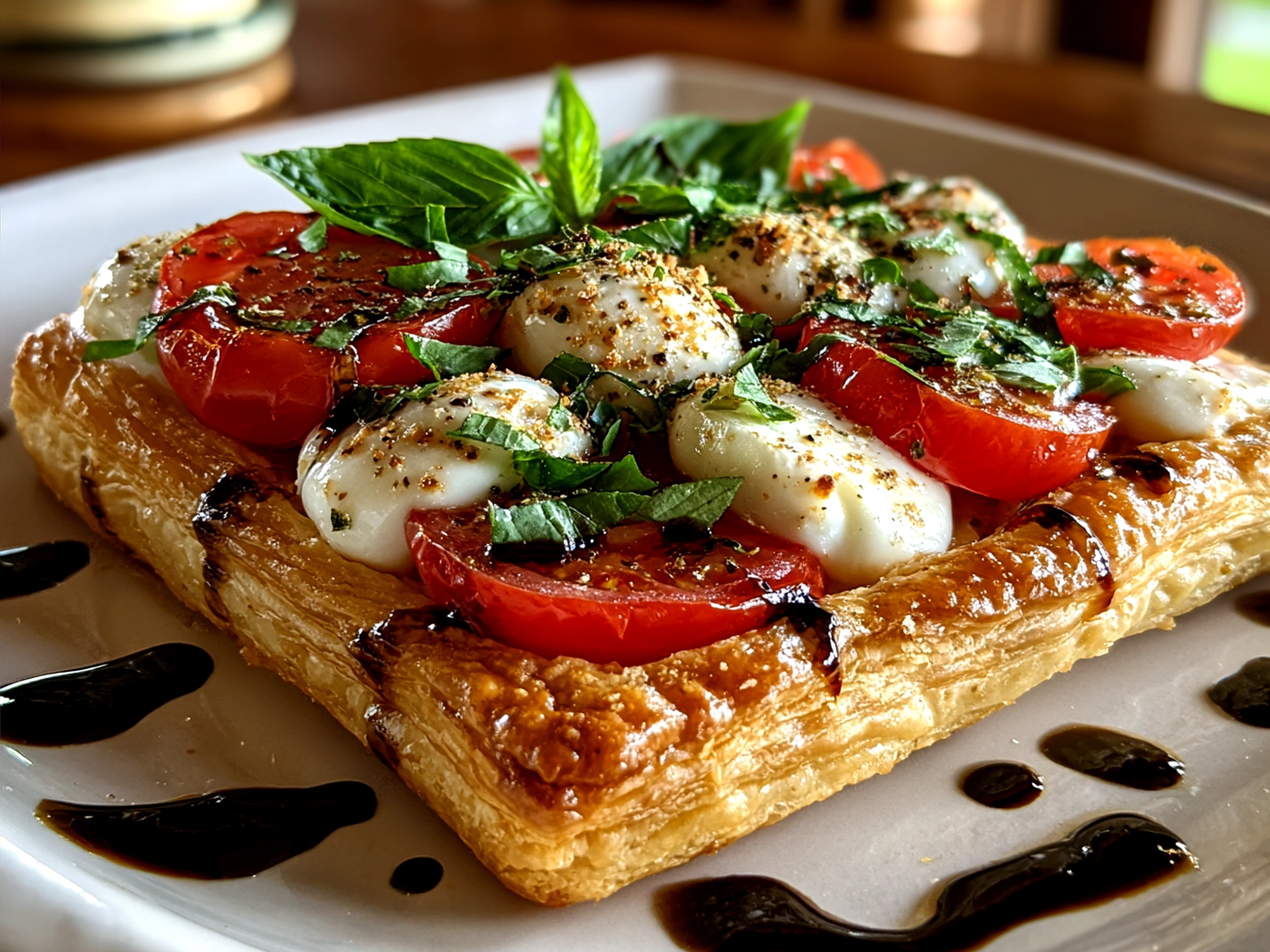 If you’re making Puff Pastry Caprese in advance, bake it fully but hold off on glaze and fresh basil until ready to serve. You can refrigerate for up to two days and rewarm gently in a 350°F oven for 8-10 minutes. Puff pastry holds up surprisingly well if reheated this way.